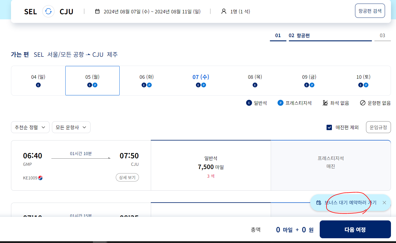 원하는 시간대에 자리가 없을경우 대한항공은 대기예약이 된다.