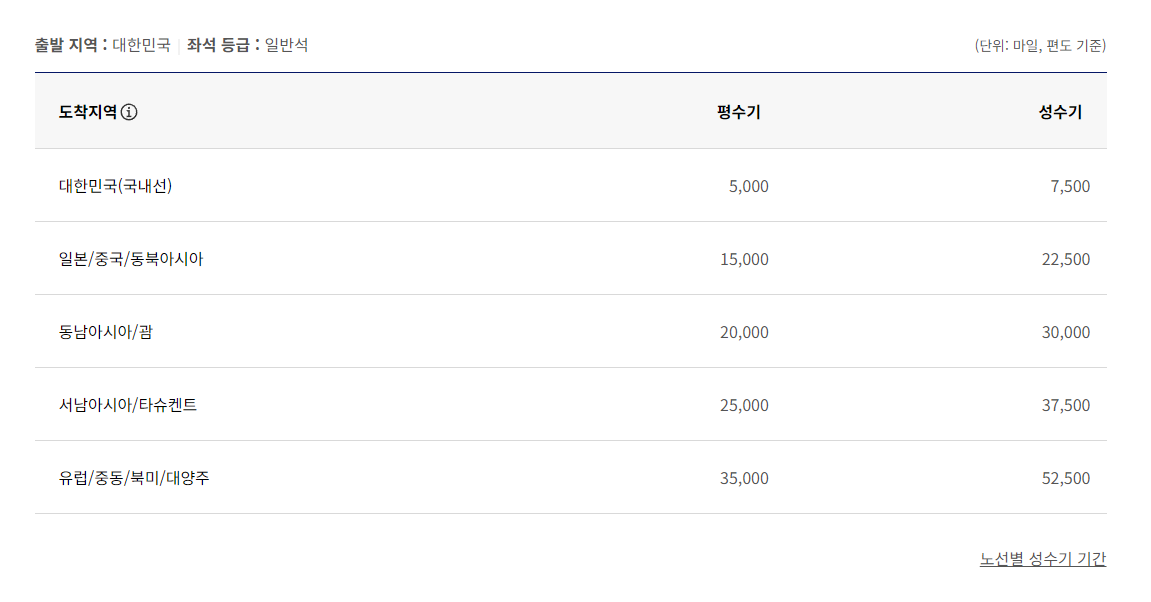 편도 성수기때 7,500 마일리지 + 유류할증료(1-2만원사이)