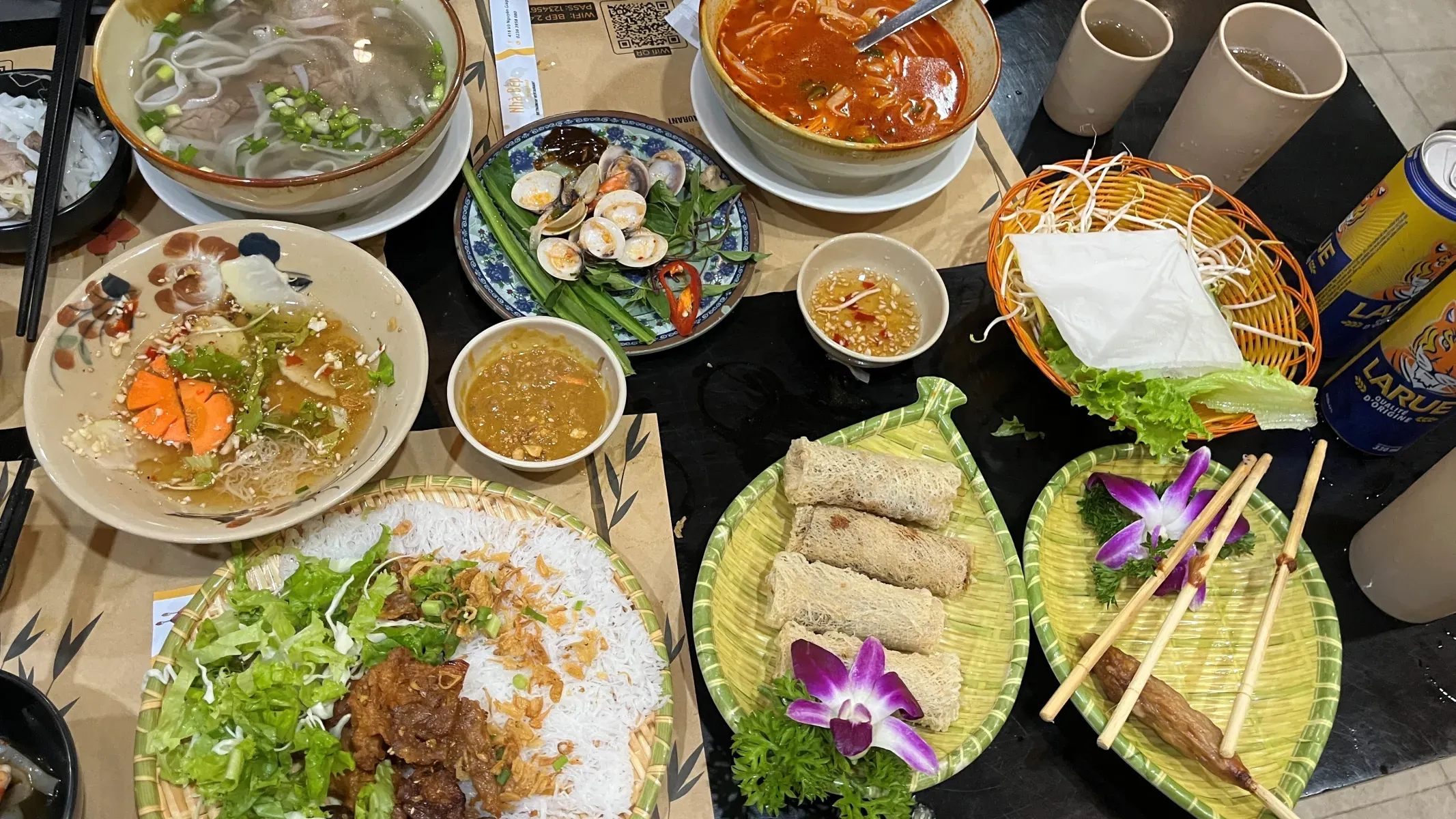 소고기쌀국수, 해산물 매운 쌀국수, 분짜, 짜조, 모닝글로리, 넴루이 with 라루비어
