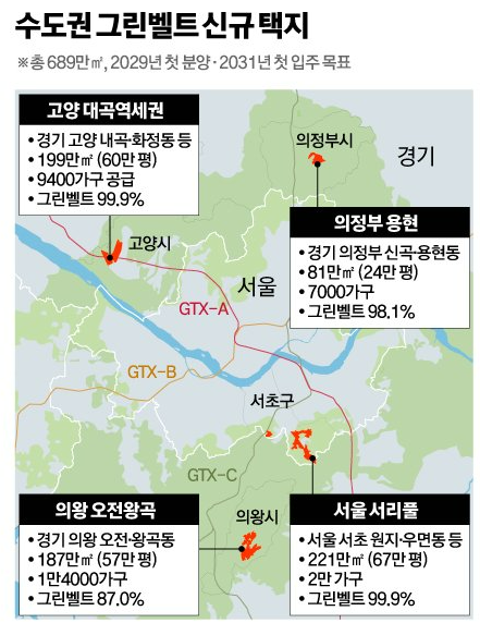 [부동산] 수도권 그린벨트 해제 신규택지/ 서울 서초서리풀, 의왕 오전왕곡, 의정부 용현, 고양 대곡역세권 / 2만가구 공급 2029년분양 2031년입주