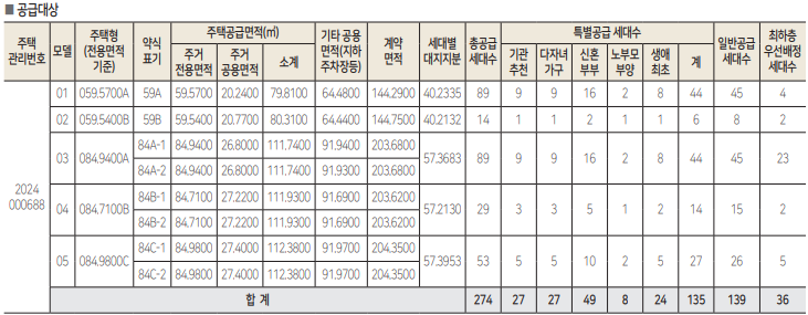 특별공급 135세대 : 기관추천 27 / 다자녀가구 27 / 신혼부부 49 / 노부모부양 8 / 생애최초 24