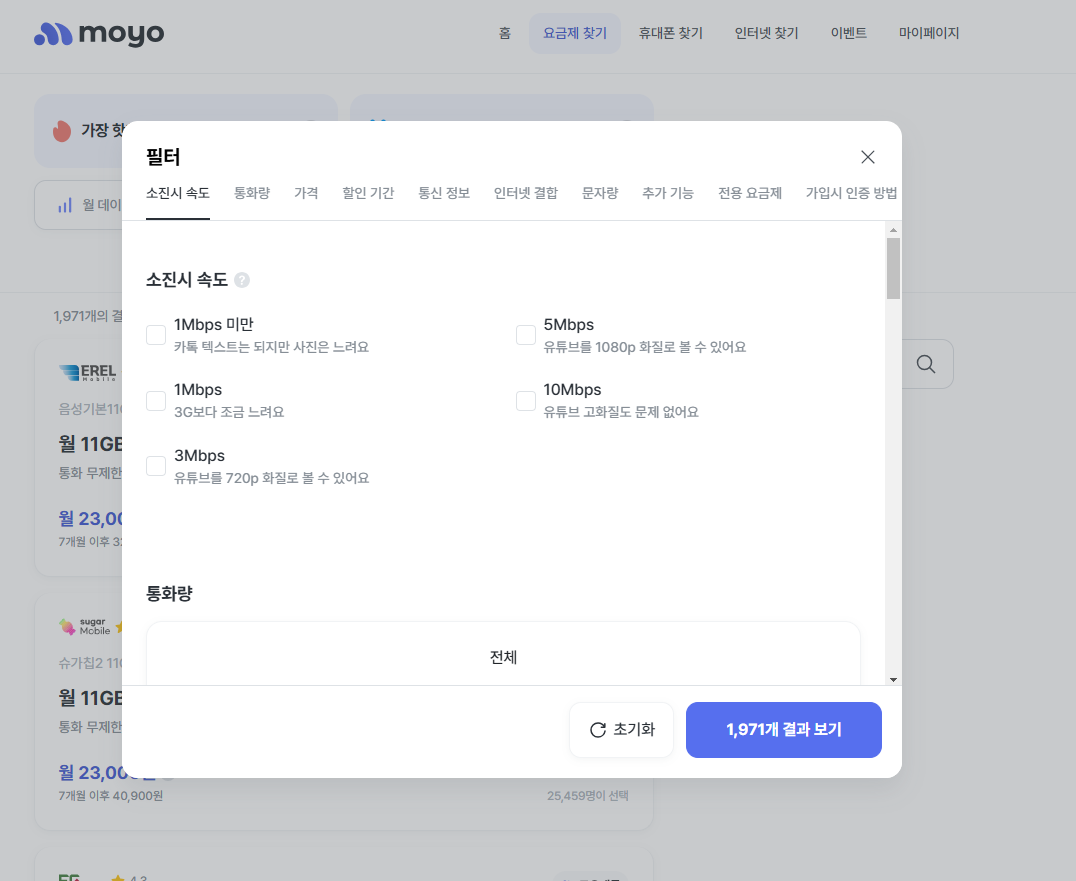 필터에서 걸려진 요금제들중 내가 원하는걸 선택하면