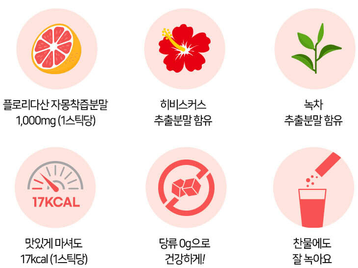 자몽을 통째로 갈아 만든 자몽착즙분말과 히비스커스, 녹차, L-카르니틴 등이 함유되어 있으면