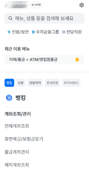 메뉴선택하기 : 이체/출금> ATM/영업점출금