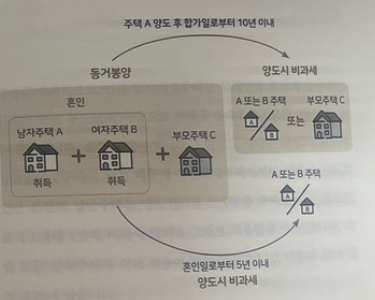서로 1주택자인 부부가 혼인하면서 1가구 2주택이 된경우 5년이내 1주택을 매도할 경우 양도세비과세 적용이 된다.