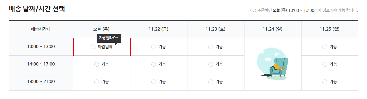 장바구니에 담은 물건을 구매하면 이렇게 배송시간을 선택할 수 있다