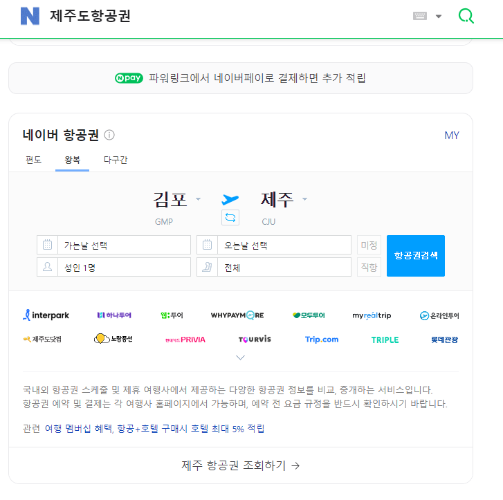 네이버에 '제주도항공권'이라고 검색한다.