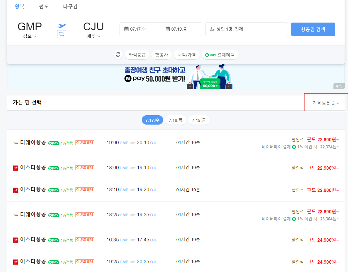 일단 내가 원하는 시간대의 최저가를 찾기위해 가격낮은순으로 검색한다.