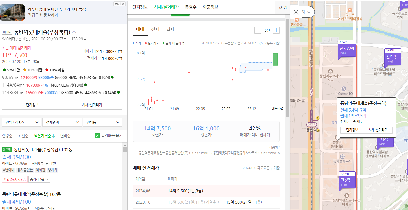 최근에 84B타입이 14.5억에 거래가 되었고 전세가는 7억정도